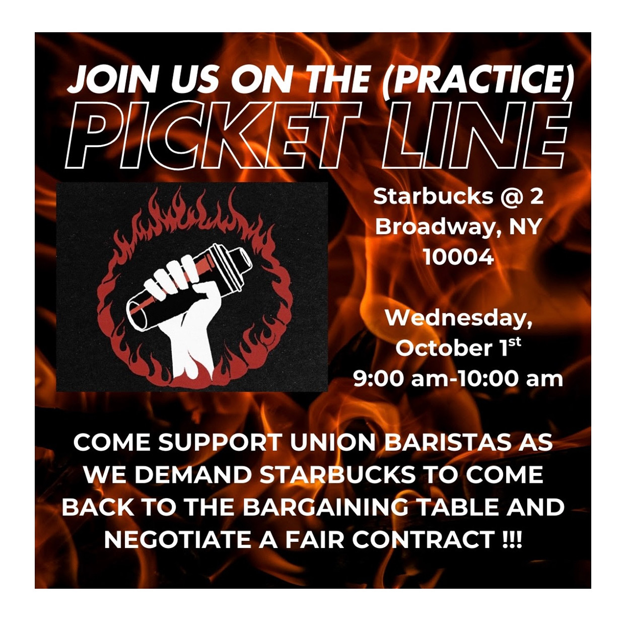 Starbucks baristas are calling on allies and customers for support! They are engaging in a practice picket on Wednesday, October 1, from 9-10am at the 2 Broadway Starbucks in Manhattan. Join them as they continue their fight for a fair contract!