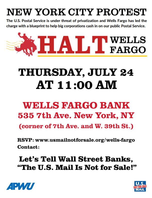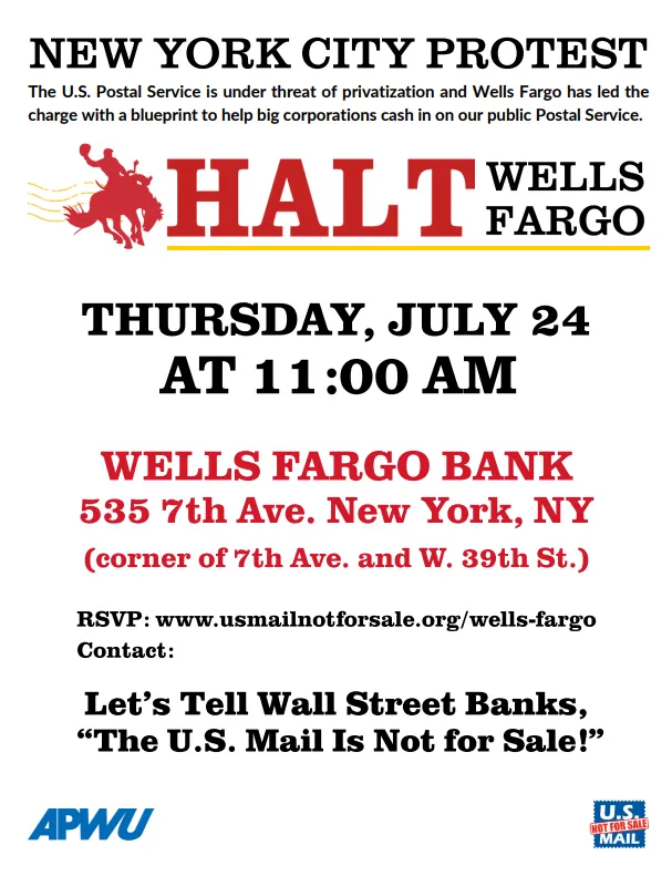 Events The US Mail is Not for Sale July 24, 2025 11:00AM - 1:00PM 535 7th AvenueNew York, NY 10018 RSVP Social share icons The U.S. Postal Service is under threat of privatization and Wells Fargo has led thecharge with a blueprint to help big corporations cash in on our public Postal Service. Join us in telling Wells Fargo that the U.S. Mail is Not For Sale.