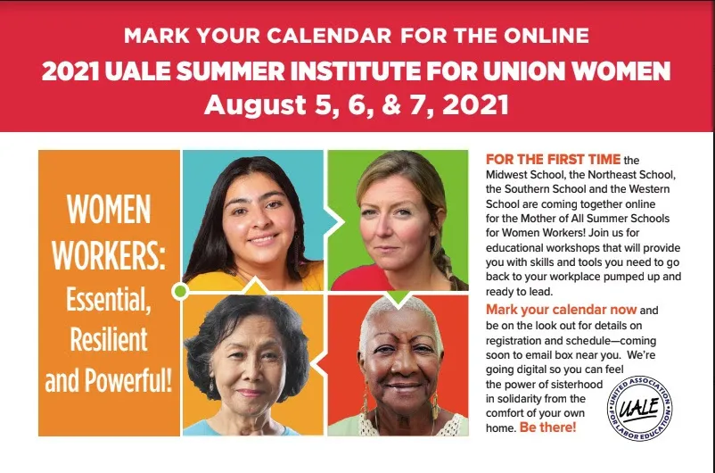 August 5, 6 & 7: Every year, UALE sponsors 4 regional “women’s schools”. These programs typically last between 4 and 5 days, and include classes and workshops on a variety of labor-related topics. Women from all over the country and beyond learn the skills and knowledge needed to play leadership roles in their organizations. Visitors from labor unions and workers’ organizations in other countries frequently participate. One of the most valuable aspects of the schools is the chance to meet and network with other labor women from around your region and beyond. In 2021, for the first time all 4 regional schools are coming together online for the Mother of All Summer Schools for Women Workers! Join us for educational workshops that will provide you with skills and tools you need to go back to your workplace pumped up and ready to lead. Click here to register!