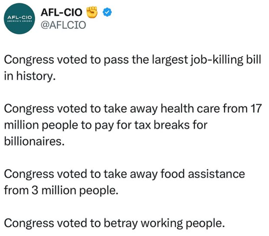 “Today, Donald Trump signed into law the worst job-killing bill in American history. It will rip health care from 17 million workers to pay for massive tax giveaways to the wealthy and big corporations, amounting to the country’s largest money grab from the working class to the ultra-rich. Every member of Congress who voted for this devastating bill picked the pockets of working people to hand billionaires a $5 trillion gift. But if the politicians who rammed through this shameful bill think they can sneak away without anyone knowing the damage they’ve done and the chaos they’ve created, they don’t know anything about the labor movement.