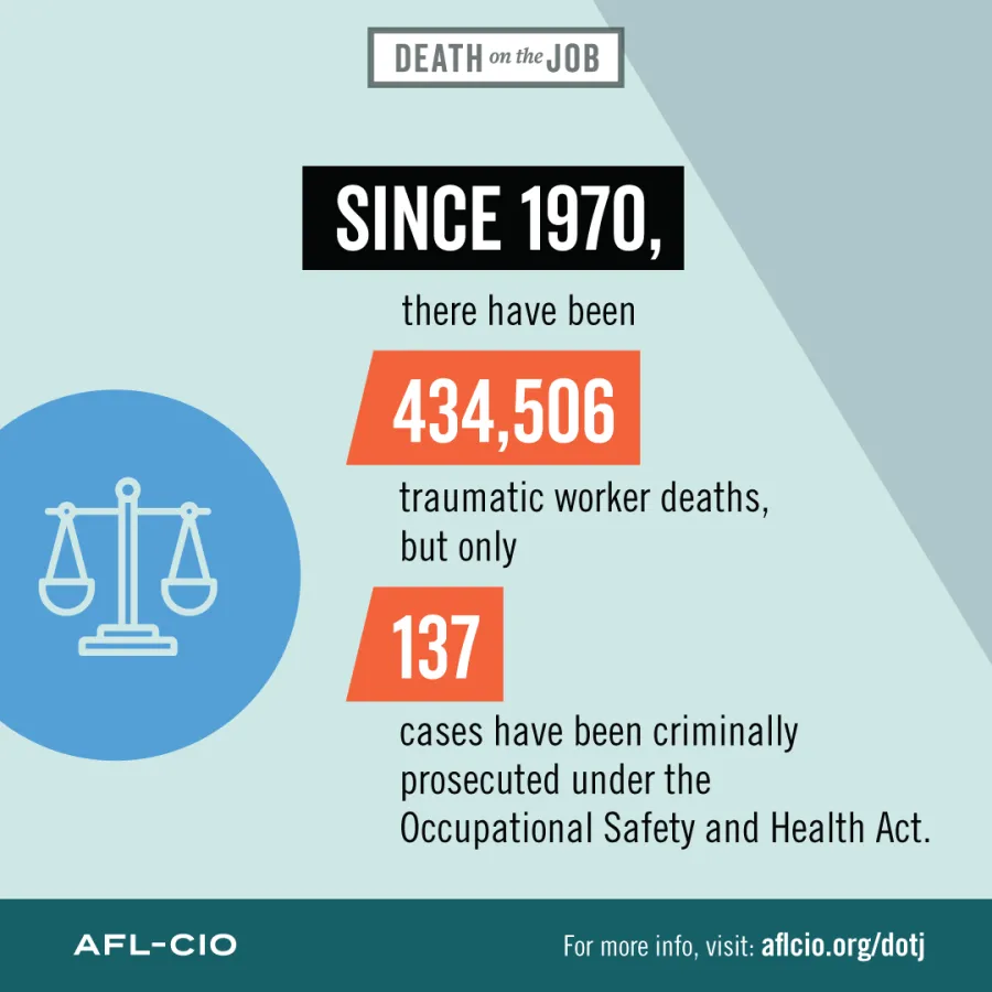 This week the AFL-CIO released its 33rd annual report, Death on the Job: The Toll of Neglect. This annual report serves as a national and state-by-state profile of worker safety and health, offering direction to policymakers and regulatory bodies as they strive to address the scourge of working people facing death, injury and illness at work. Among the report’s startling data are the disproportionate rates of Latino and Black workers at risk of dying on the job. Black workers are facing the highest job fatality rates in nearly 15 years and Latino workers continue to face the greatest risk of dying on the job, compared to all other workers. The report also sheds light on the enormous cost of job injuries and illness on our society—an estimated $174 billion to $348 billion a year—and the flat-funded budget for job safety agencies to fulfill their growing duties, which do not even keep up with inflation. It also outlines key strategies to address this crisis, including a renewed commitment to regulatory oversight agencies, improved data and transparency, stronger deterrents against employer retaliation, and prioritizing standard-setting and enforcement. Read more here.