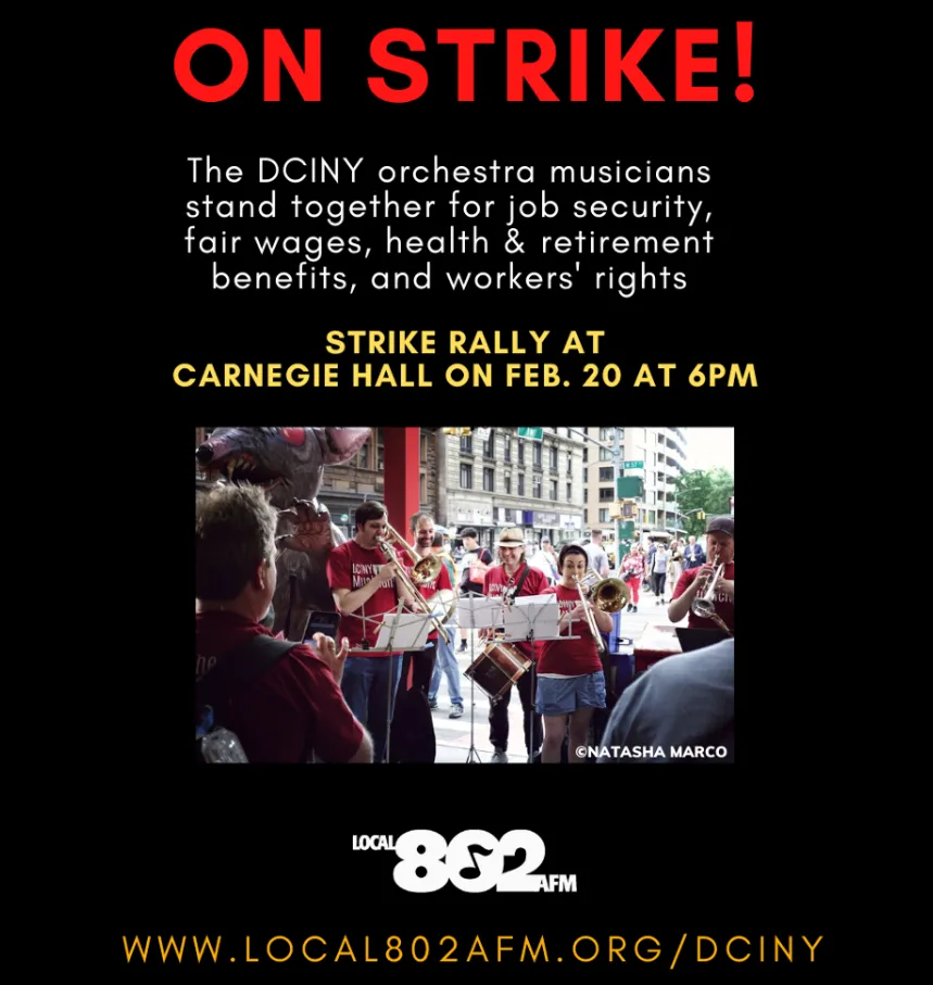 A rally with striking musicians and elected officials will take place in front of Carnegie Hall on Monday, Feb. 20 at 6pm, scroll down to upcoming events for details and follow the union on Twitter and Instagram!