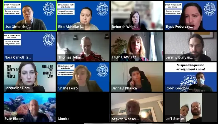 The Association of Legal Aid Attorneys/UAW Local 2325 held a virtual rally on Wednesday to demand the New York State Office of Court Administration and Governor Hochul reinstitute virtual arraignments until the rates of COVID-19 positivity have subsided to lower levels. As part of the event, advocates shared first-hand accounts of the constant exposure and proliferation of infections within Arraignments.