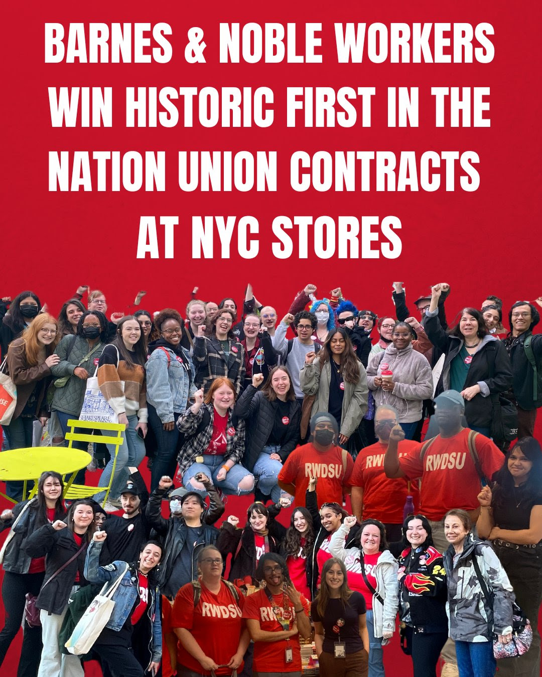 The Retail, Wholesale and Department Store Union (RWDSU) yesterday announced the ratification of first union contracts at three New York City Barnes & Noble stores. The union, which represents nearly 40 percent of locations of large booksellers in the city, raised the standard for safety, wages, and healthcare for their newest union members. These are the first union contracts for any Barnes & Noble workers in the nation and collectively cover over 200 workers across three New York City stores including the Flagship Union Square store below the corporate headquarters.