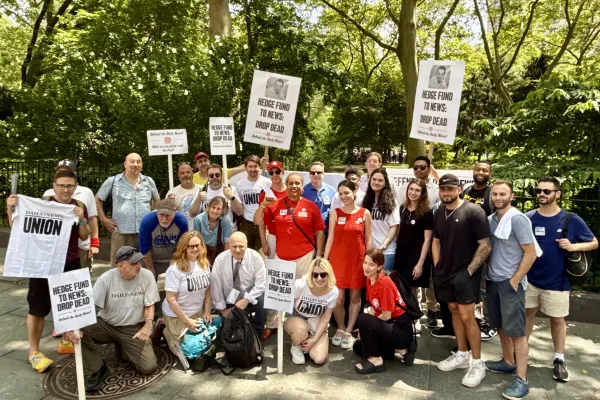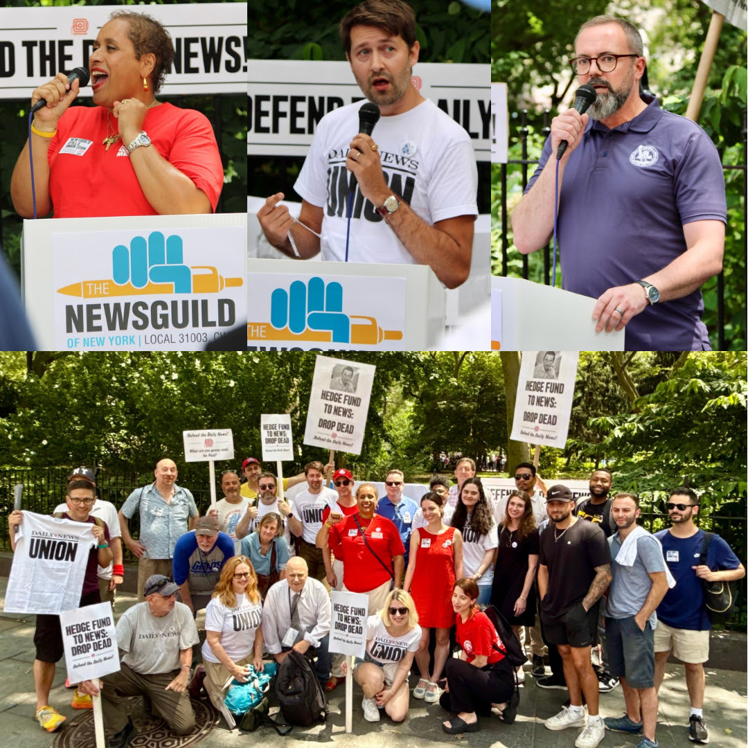 Members of the Daily News Union and The NewsGuild of New York on Monday hosted a “Defend the Daily News” rally outside City Hall alongside elected officials and other supporters including the CLC. The rally took place just before a City Council meeting at which Councilwoman Carmen De La Rosa introduced a resolution calling out the destructive practices of Daily News owner Alden Global Capital and strongly urging the predatory hedge fund to reach a contract deal with the newspaper’s union. The resolution, which is expected to be on the agenda for the August stated meeting, will be the strongest rebuke by elected officials of the hedge fund since Alden Global Capital began to take over newspapers across the country.