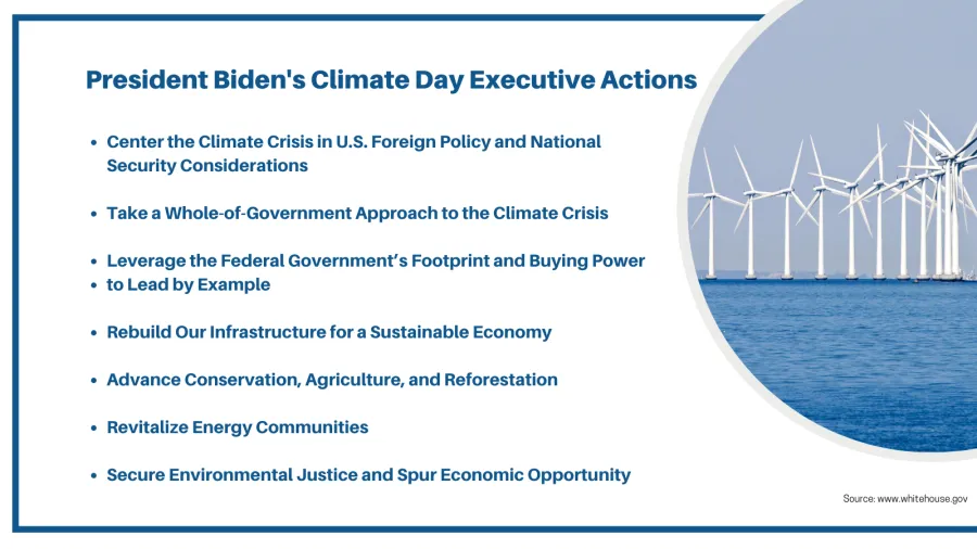 The order will take “historic strides” in addressing environmental justice, assessing how climate change is impacting U.S. foreign policy and national security, establishing a Working Group on Coal and Power Plant Communities to help workers transitioning out of the oil and gas industries and planning to double offshore wind production by 2030.
