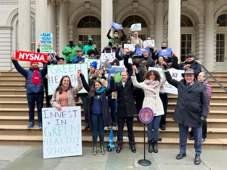 On Thursday, Climate Jobs NY joined with unions, elected officials, and environmental justice advocates on the steps of City Hall to call on Mayor Adams and the New York City Council to implement our Carbon Free and Healthy Schools Initiative (CFHS).