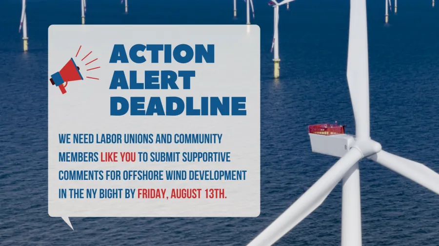 The Bureau of Ocean Energy Management (BOEM) is seeking public comment on a proposed sale notice for the offshore wind energy areas in the NY Bight, far off Nassau County's shores. The New York labor movement has fought and secured strong labor standards for offshore wind and large-scale renewable energy projects here in New York, and now we need to establish strong standards at the federal level, starting with the NY Bight.