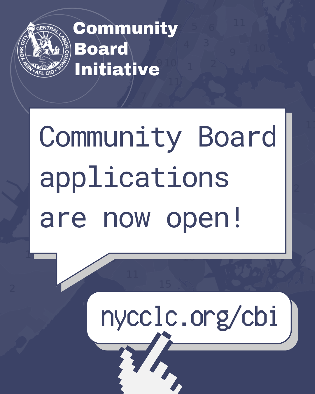 Through our Community Board Initiative, the NYC CLC is committed to building a stronger pro-worker city and supporting communities for working people. If you are interested in learning more about Community Boards and how you can make an impact in your neighborhood, please contact Xiomara Loarte at xloarte@nycclc.org.