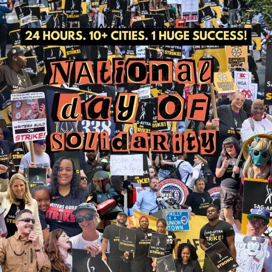 Entertainment industry workers, nurses, teachers, construction and building trades workers, retail workers, communications workers—every unionized industry in NYC seemed to be out on the street Tuesday for a National Day of Solidarity in support of striking WGA and SAG-AFTRA members. The NYC event took place in front of the HBO/Amazon location in Hudson Yards, and was part of a day of actions across the country that included Philadelphia, Chicago, Los Angeles, Atlanta, Seattle, Anchorage and more. In this “Summer of Strikes,” working Americans everywhere are fighting for fair contracts, better compensation, safe working conditions and protections from encroaching technology. Support is growing, momentum is building, and these workers are standing strong. Read more about the NYC rally in Deadline, and scroll down to view more photos & to find upcoming pickets and other ways to support these striking workers as they continue their fight!