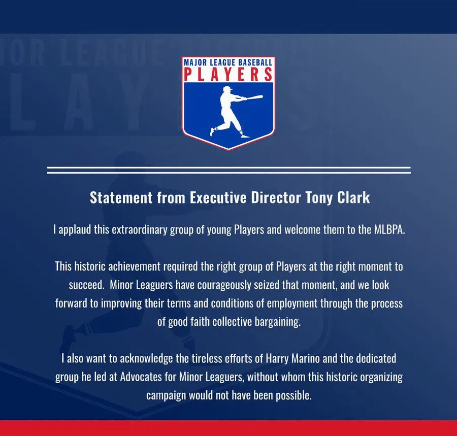 For the first time since Branch Rickey developed the modern farm system, minor league baseball players will be represented by a union. An independent arbiter found Wednesday that authorization cards submitted by minor league players this month yielded a majority in favor of unionizing under the supervision of the Major League Baseball Players Association. That means the minor league players are officially unionized, represented by the MLBPA. "Minor leaguers have gone more than a century without union representation. In a multibillion-dollar industry, there is no excuse to pay these players below the poverty line," said AFL-CIO President Liz Shuler. "Now, by joining together to use their collective voice at the bargaining table, the minor leaguers will be able to advocate for a union contract that will ensure a future with the good pay and benefits they deserve." Read more in The Nation, the Washington Post and Bleacher Report.
