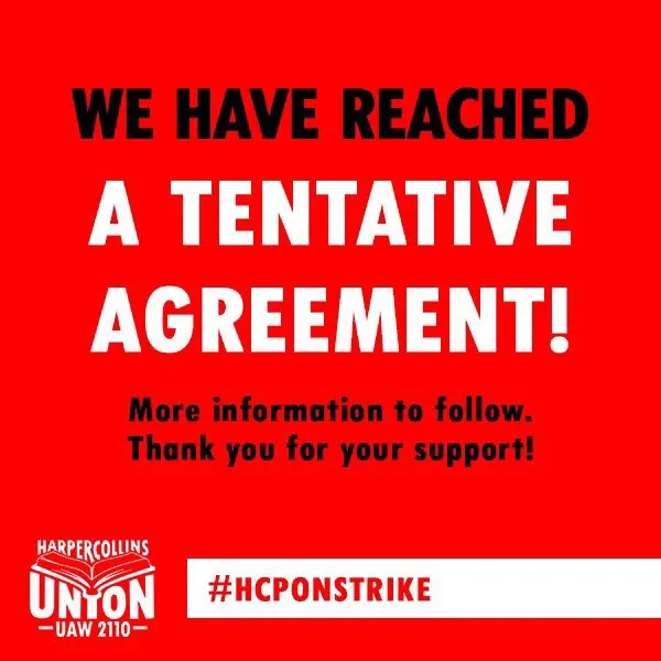 After thirteen weeks on strike, members of the HarperCollins Union announced last night that they have reached a tentative agreement that includes increases to minimum salaries across levels and a $1500 lump sum bonus to all union employees. UAW Local 2110 represents 250+ employees in editorial, sales, publicity, design, legal, and marketing departments.