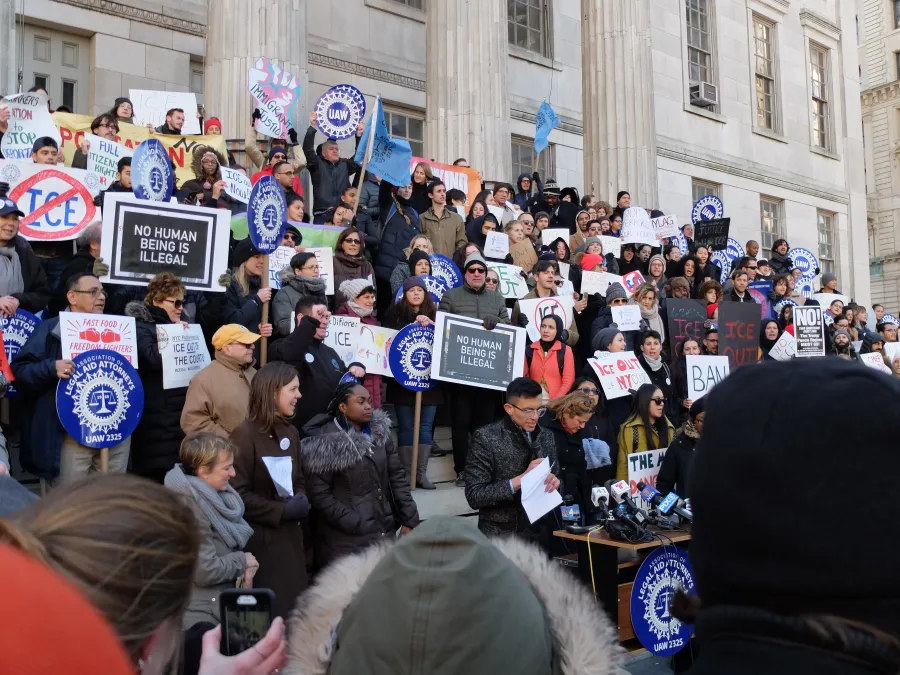 On Thursday, the Association of Legal Aid Attorneys, UAW Local 2325, took to the steps of Brooklyn Borough Hall with allies in the Labor Movement, community groups, and immigration advocates to speak out against the practice of ICE agents arresting and detaining undocumented immigrants as they arrive for court appearances.