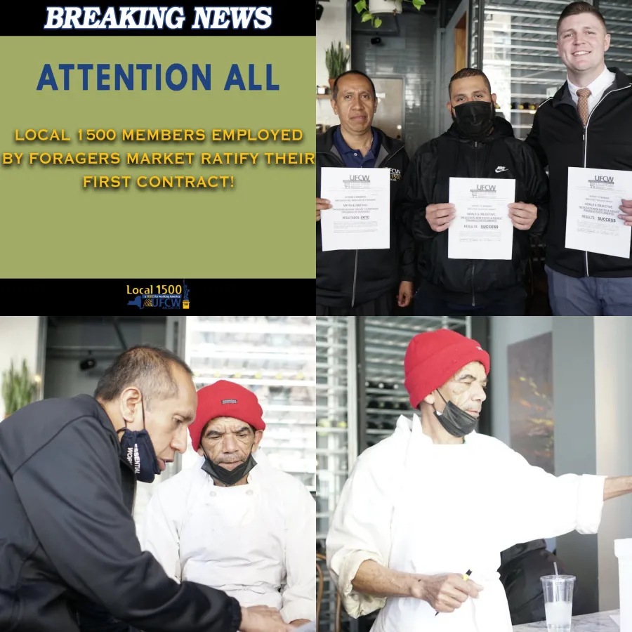 This week, UFCW Local 1500 members from Foragers Market announced that they have voted to ratify their inaugural contract, which runs for 2 years. The workers at two Foragers Market stores in Chelsea and Brooklyn joined UFCW Local 1500 in April 2021 because they were concerned about arbitrary pay cuts, scheduling issues, sick leave violations, unfair and cruel treatment from management, lack of raises and benefits, and arbitrary and unfair terminations.