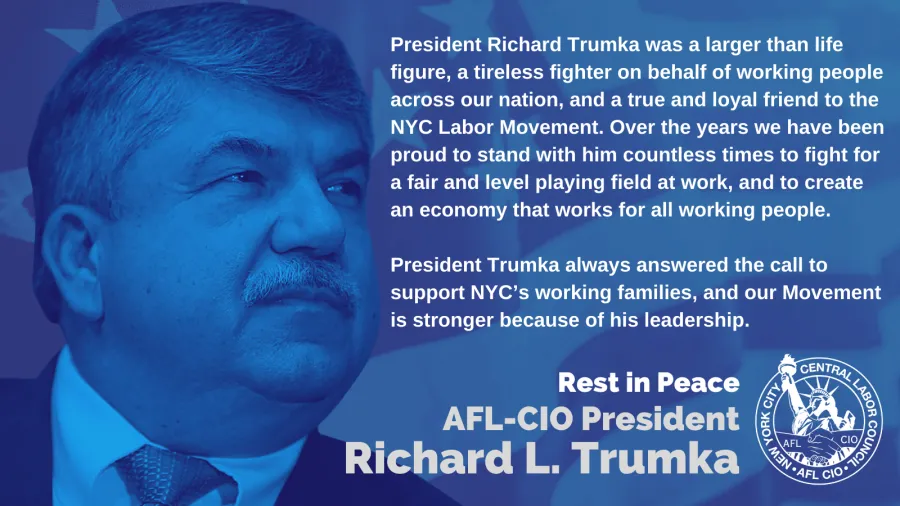 The New York City Labor Movement was shocked and profoundly saddened to learn yesterday of the sudden passing of AFL-CIO President Richard L. Trumka. As leader of our nation’s Labor Movement, he championed the belief that all work has dignity, along with the rights of all working people to bargain collectively, to fair wages and workplace safety, and to a voice at work.