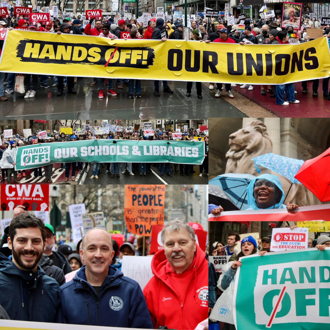 The NYC CLC and affiliates joined in a massive Hands Off! march through the heart of Manhattan Saturday, standing united against attacks on workers’ rights and devastating cuts to the essential services Americans rely on. A broad coalition of more than 100,000 people including unions from across New York City came together at Bryant Park and filled 5th Avenue for a march that stretched nearly twenty blocks to Madison Square Park. The energy was electric, and the message was clear: we won’t back down in the fight to protect our rights, our democracy, and our future.