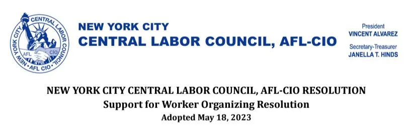 The Executive Board of the NYC CLC on Thursday, May 18th adopted a resolution in support of worker organizing, reaffirming our support for workers across all sectors of New York City who face significant challenges in organizing and bargaining for living wages, benefits, and better working conditions. The NYC CLC resolved to work to mobilize its affiliates and allies to support worker campaigns, including new organizing/union recognition campaigns, contract campaigns, and strikes, through public education and outreach, direct action, and political advocacy; and that the NYC CLC will make available its own resources to affiliates and to unorganized workers in support of such actions. Click here to read the full resolution.