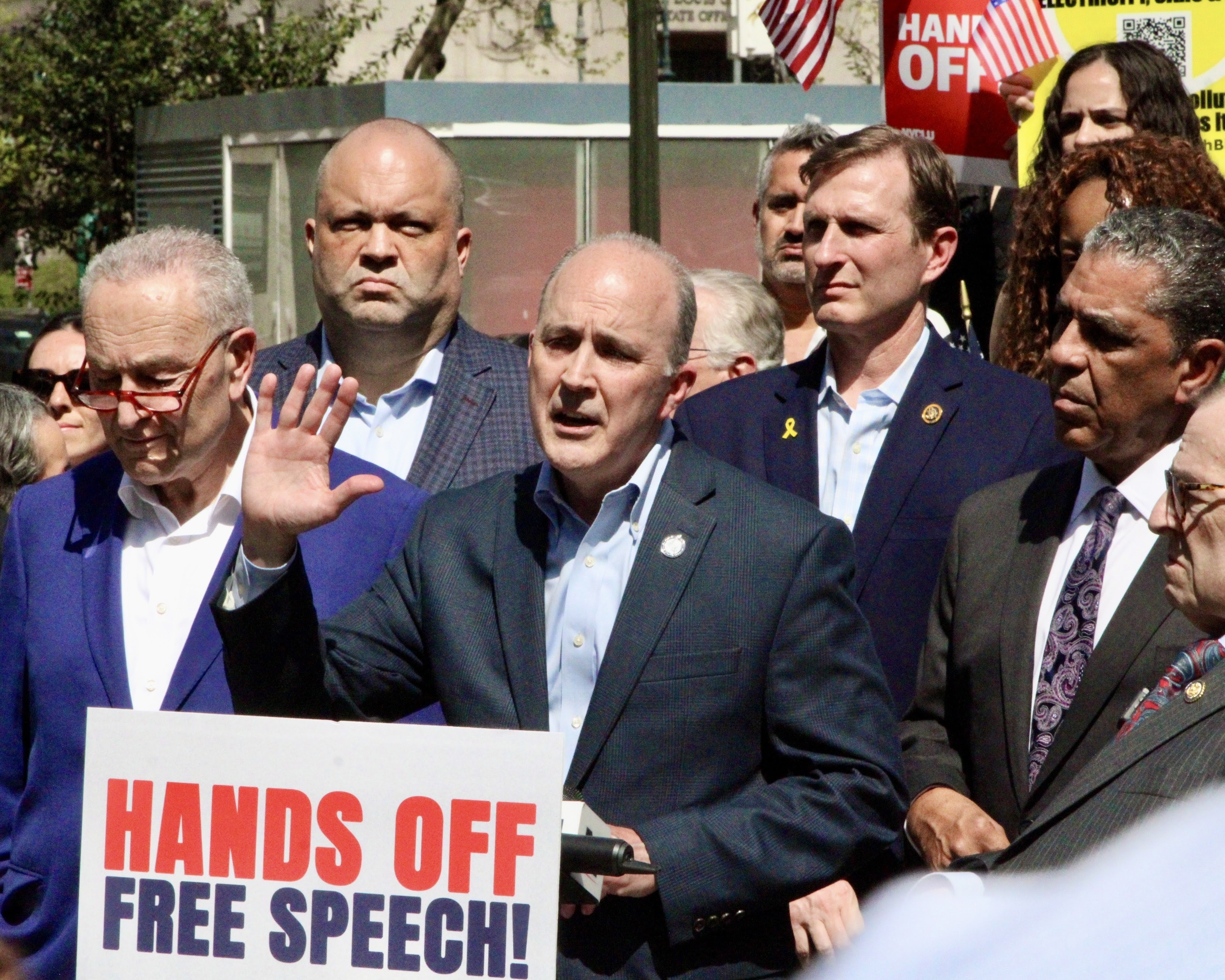 On Tuesday, the New York City Central Labor Council, AFL-CIO joined Senators Chuck Schumer and Kirsten Gillibrand, NY House Representatives, environmental advocates, civil rights organizations, community groups and more to denounce reports of a looming Executive Order from the Trump Administration that would threaten the tax-exempt status of nonprofit organizations that the Administration disagrees with. This kind of political attack—reportedly targeting environmental groups first—would be an assault on free speech and the essential role that nonprofits play in building a fairer, healthier, and more democratic society.