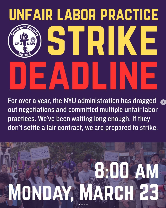 Contract Faculty United–UAW members at New York University have set an unfair labor practice strike deadline as negotiations with the university administration continue to stall. After more than a year of bargaining and repeated labor law violations by NYU, including refusal to negotiate over key benefits such as housing, unilateral changes to terms and conditions of employment, and attempts to prevent non-union coworkers from honoring picket lines, a supermajority of contract faculty voted to authorize a strike, with 90% of voters supporting the action.