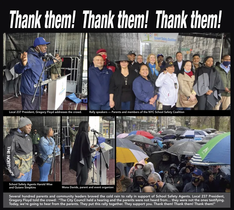 On Monday, hundreds of parents and community leaders braved the cold rain to rally in support of School Safety Agents, members of Teamsters Local 237. Local 237 President Gregory Floyd told the crowd: “The City Council held a hearing and the parents were not heard from... They put this rally together. They support you!"