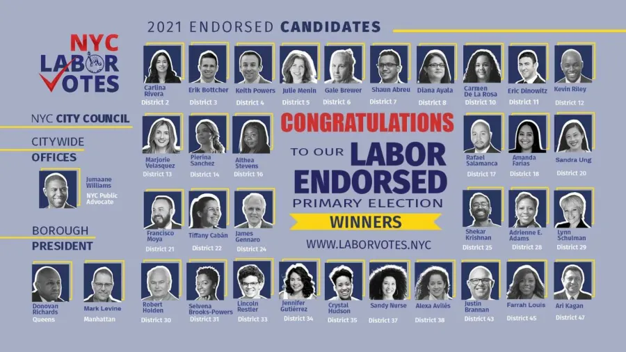 The NYC Central Labor Council, AFL-CIO congratulates all of our winning endorsed candidates in this year's primary elections, and we thank the many working people who participated in our City's political process by phonebanking, texting, knocking on doors and most importantly VOTING for pro-labor candidates across all levels of city government. We look forward to working to elect our endorsed candidates in November, and to working with all of our elected leaders, including our new Mayor and Comptroller, in addressing the issues most important to working New Yorkers and their families, including our recovery from the pandemic and the resulting economic crisis, the revival of hard-hit industries, protecting jobs and critical city services, and growing our city's economy. Together, we can build a New York City that works for all working families.