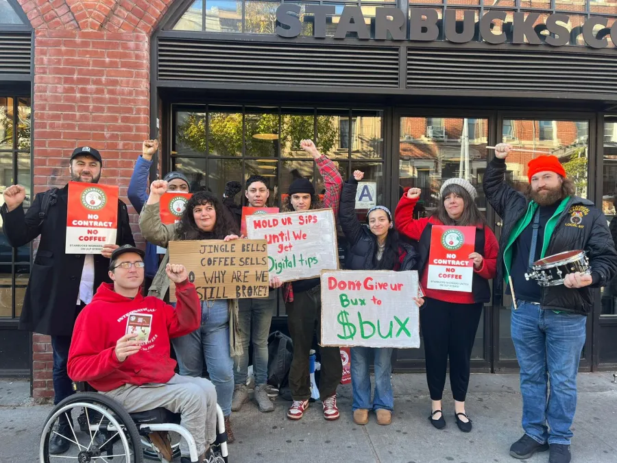 Starbucks workers from nine stores in Brooklyn, Queens, Manhattan and Staten Island, as well as Nassau and Suffolk counties, struck alongside thousands of workers nationwide on November 15 and 16, in a coast-to-coast “Red Cup Rebellion,” demanding the coffee giant stop illegally refusing to bargain with baristas over staffing, scheduling and other issues. In our region, stores in Lynbrook and Staten Island kicked off the strike Wednesday, and were joined by stores in Queens, Brooklyn, Manhattan, Farmingville and Westbury yesterday.