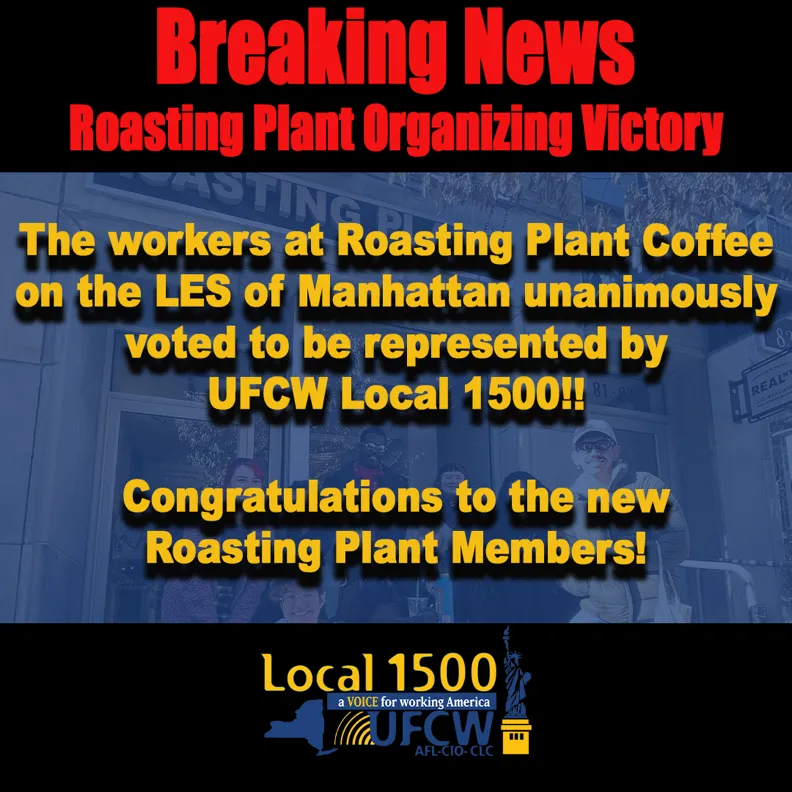 On Friday, January 24, UFCW Local 1500 was unanimously chosen to represent the workers of Roasting Plant Coffee on Manhattan’s Lower East Side. UFCW Local 1500 also represents coffee shop workers at Partners Coffee in Brooklyn and at 19 Blank Street Coffee locations throughout New York City. Congratulations to our newest members, and welcome to the UFCW Local 1500 family!