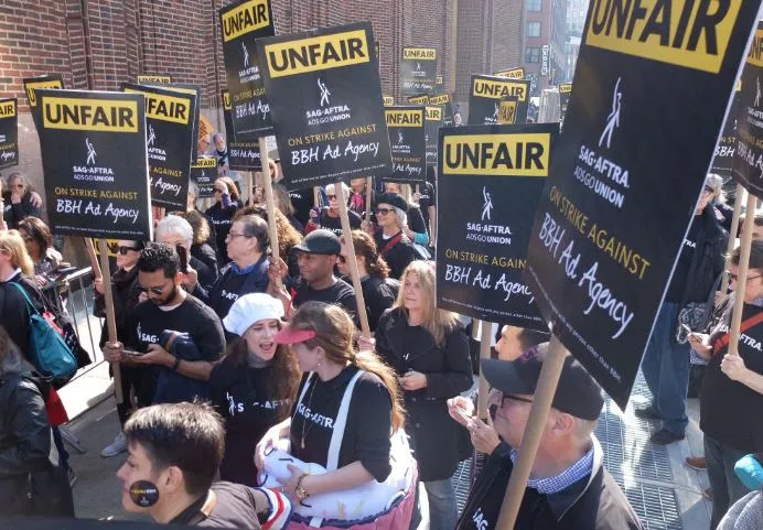 More than 400 SAG-AFTRA members rallied yesterday in front of ad agency Bartle Bogle Hegarty, LLC (BBH), which is trying to illegally abandon its union contract after almost 20 years. The rally took the form of a mock bake sale to raise funds for BBH. Thousands of baked goods were handed out.