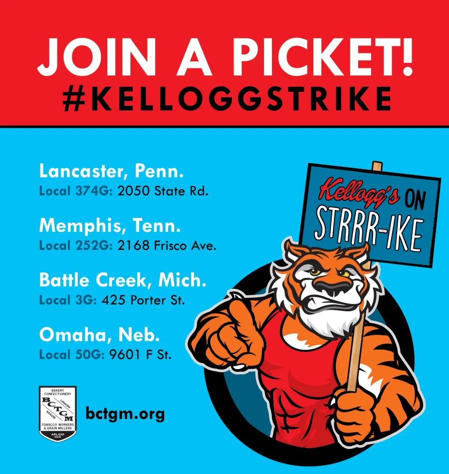 At midnight on Oct. 5, 1,400 workers at four Kellogg's Co. plants in Battle Creek, Michigan; Omaha, Nebraska; Lancaster, Pennsylvania; and Memphis, Tennessee went on strike against the company. Add your name to support members of the Bakery, Confectionery, Tobacco Workers and Grain Millers (BCTGM) who are holding strong on the picket line.