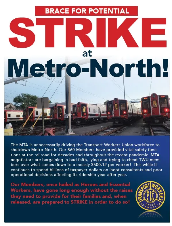 Please help by calling the MTA at 212-878-7000 and telling Janno Lieber to withdraw his ridiculous contract demands to the essential TWU workforce at Metro North!