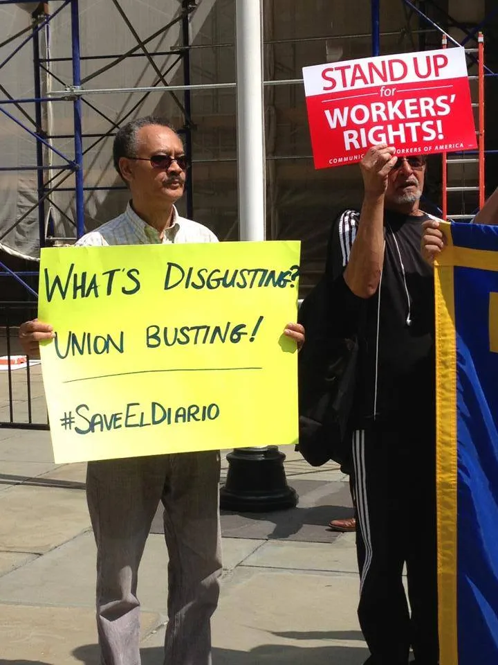 This week members of The Newspaper Guild, CWA Local 31003, were joined by supporters at City Hall denouncing the illegal firing of 12 workers by El Diario/ImpreMedia.  The workers were fired in June when the company began to implement their union-busting campaign.