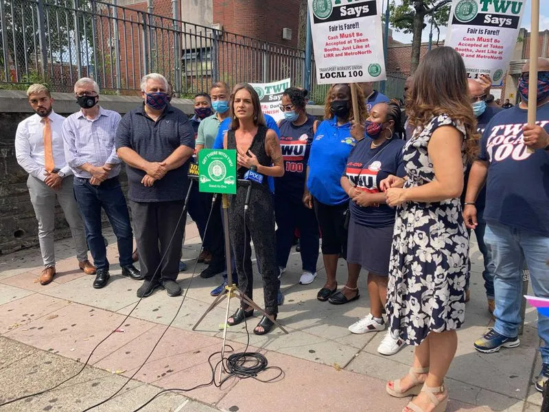 TWU Local 100 and state lawmakers demanded Tuesday that the MTA resume cash transactions at subway token booths, saying the no-cash policy started during the pandemic discriminates against low-income New Yorkers. They gathered outside Broadway Junction subway station in East New York to demand the agency immediately resume the hand-to-hand transactions, which ended in March 2020 out of concerns over the coronavirus.
